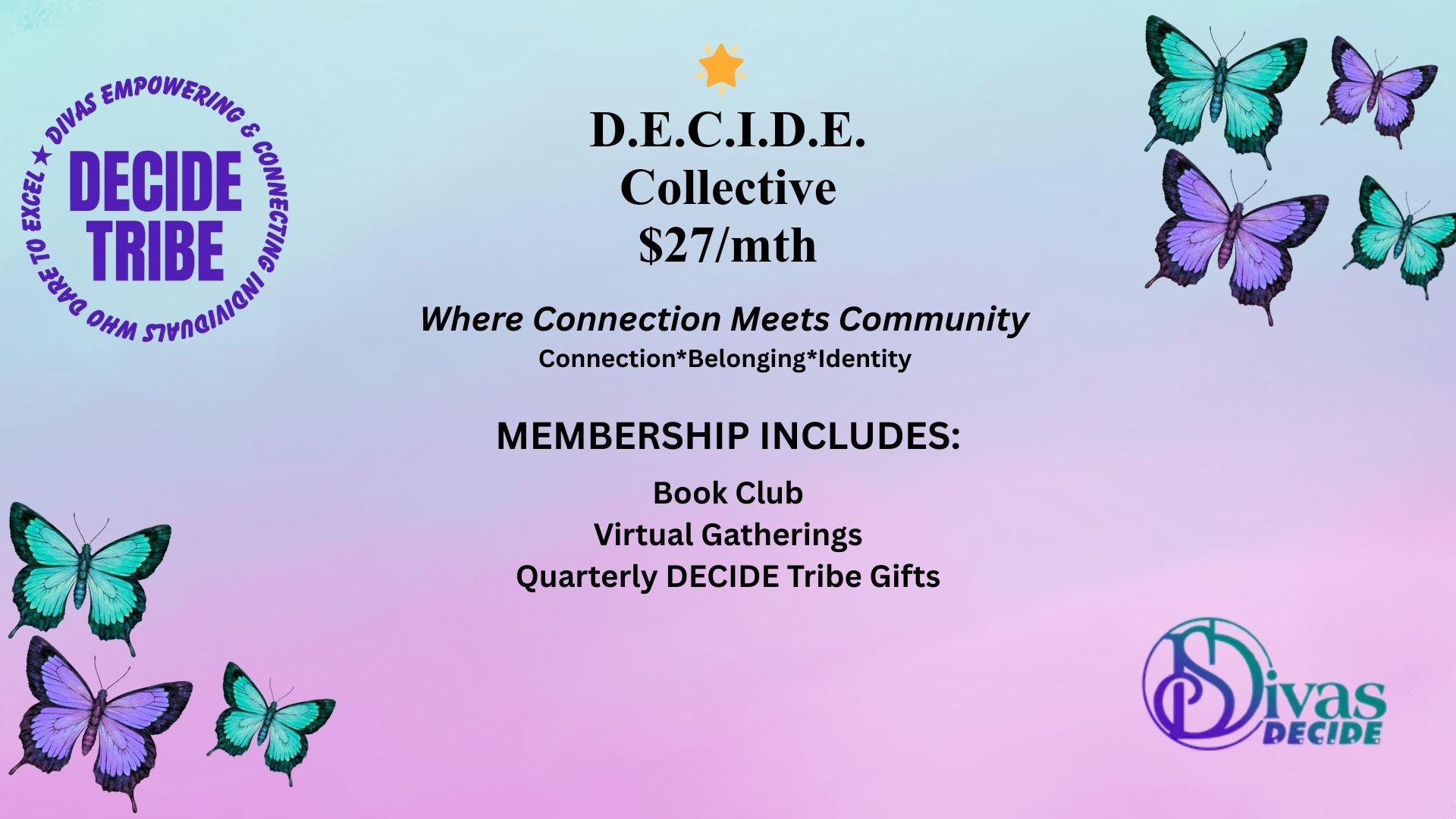 • DECIDE COLLECTIVE ($27/mth) includes Membership only community, Book Club, Virtual Gatherings, & Quarterly DECIDE Tribe Gifts