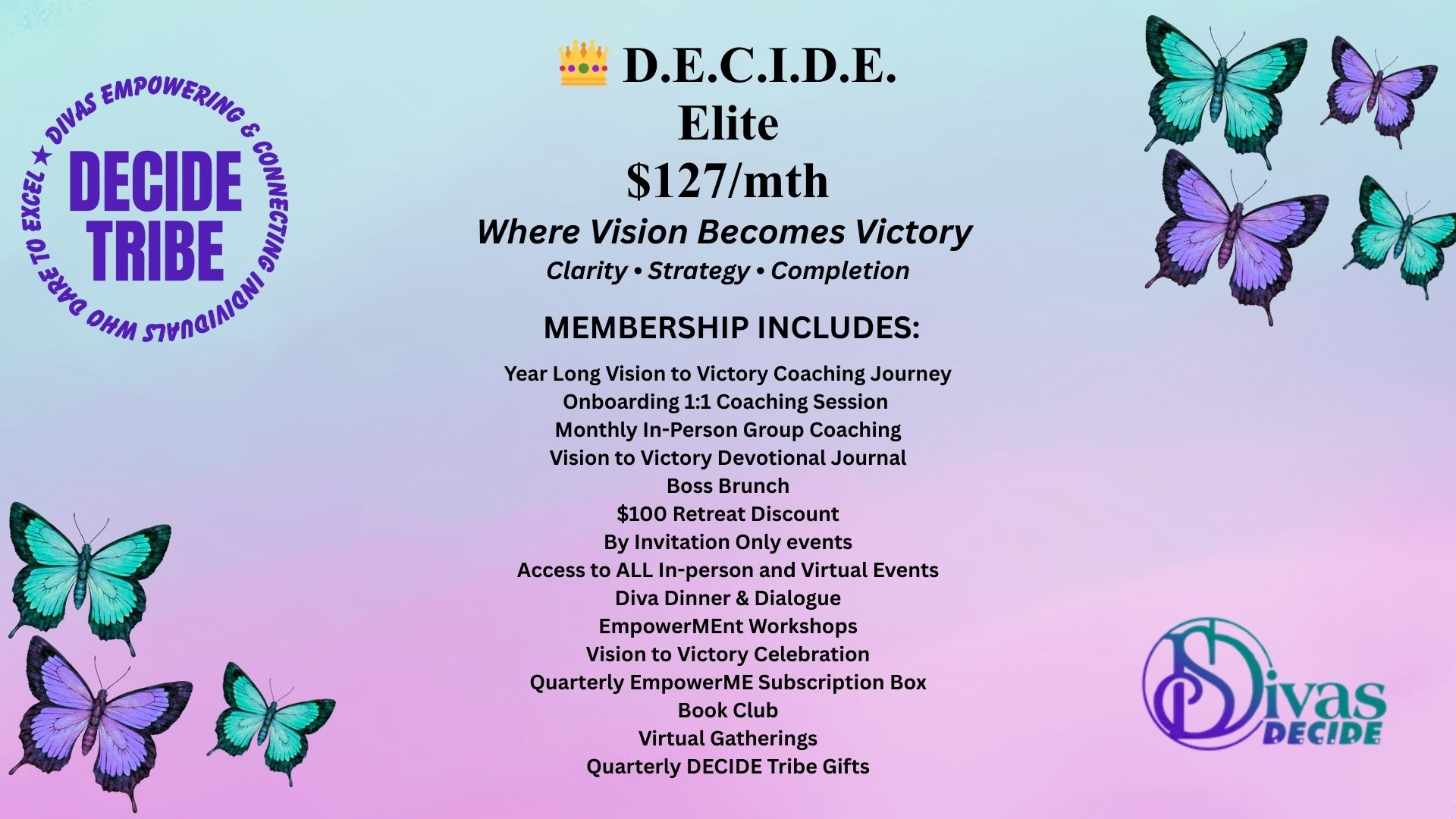 • DECIDE ELITE ($127/mth) includes DECIDE ELEVATE, Year Long Vision to Victory Coaching Journey, Onboarding 1:1 Coaching Session, Monthly In-Person Group Coaching, Vision to Victory Devotional Journal, Boss Brunch & $100 Retreat Discount