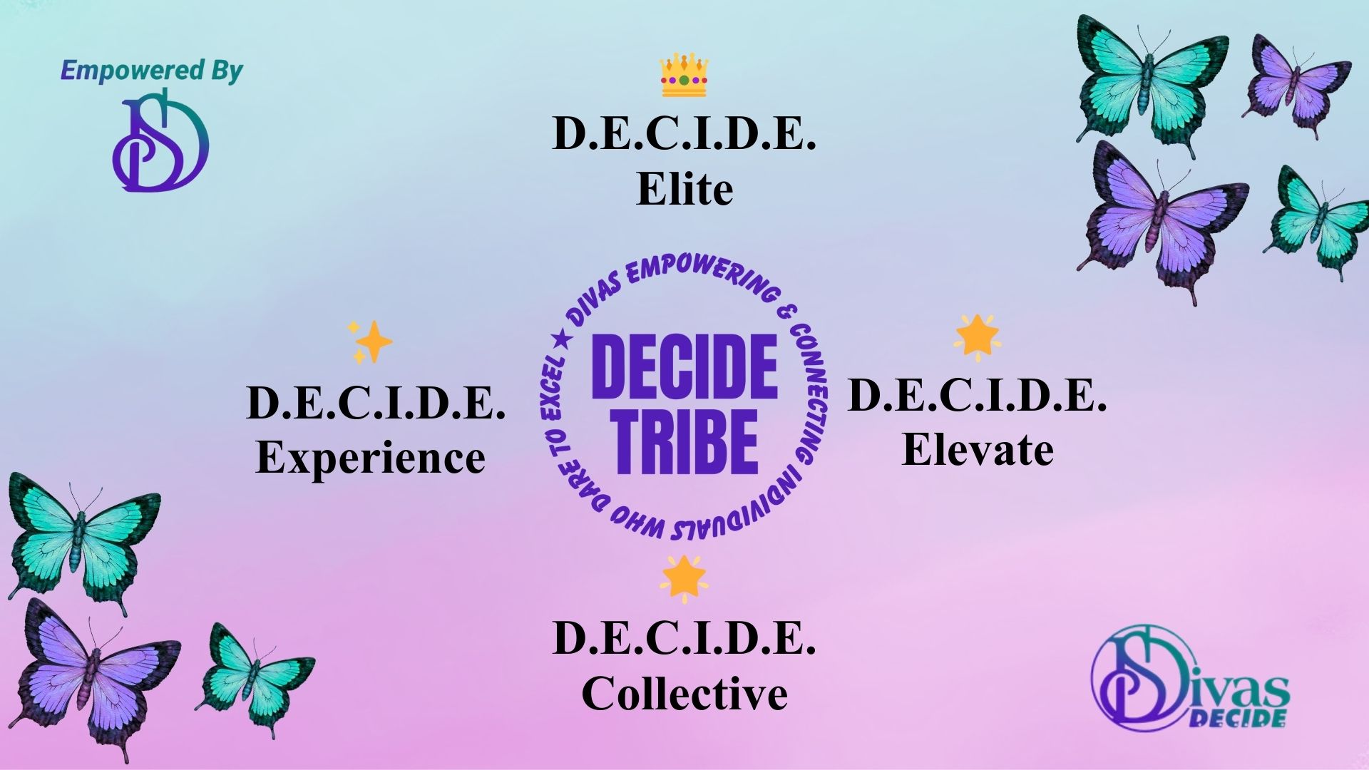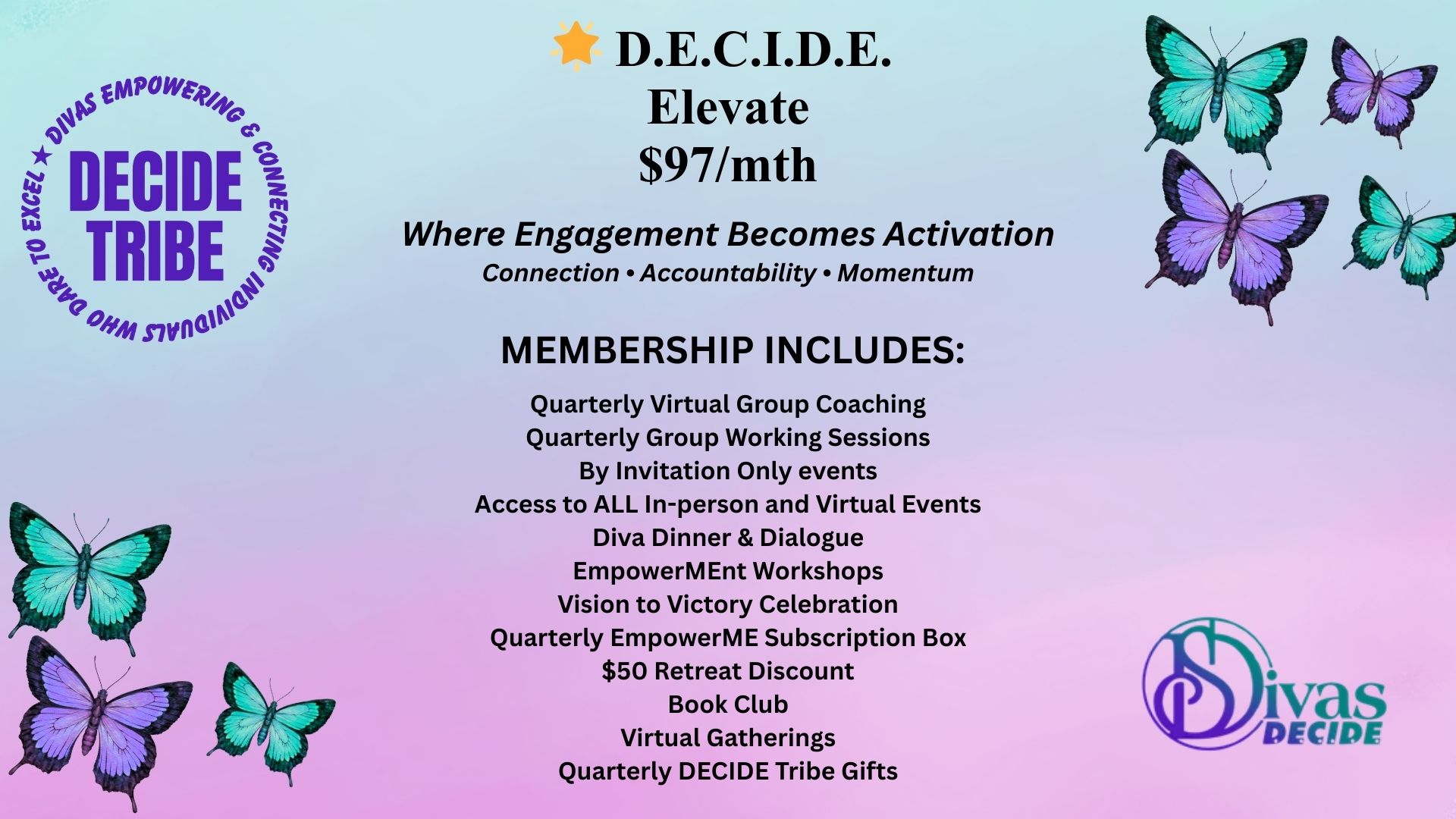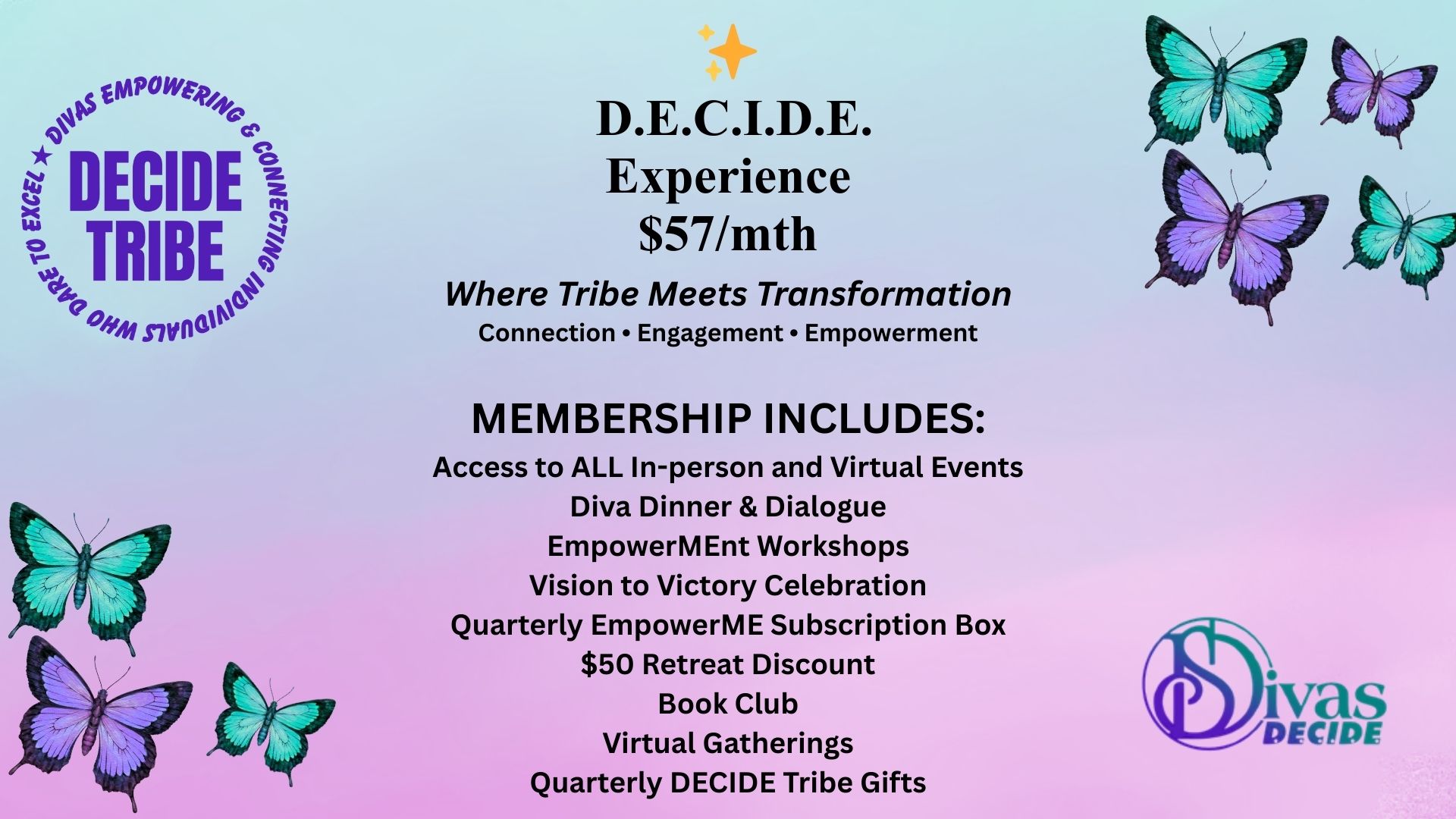 • DECIDE EXPERIENCE ($57/mth) includes DECIDE COLLECTIVE, Diva Dinner & Dialogues, EmpowerMEnt Workshops, Vision to Victory Celebration, Quarterly EmpowerME Subscription Box, & $50 Retreat Discount